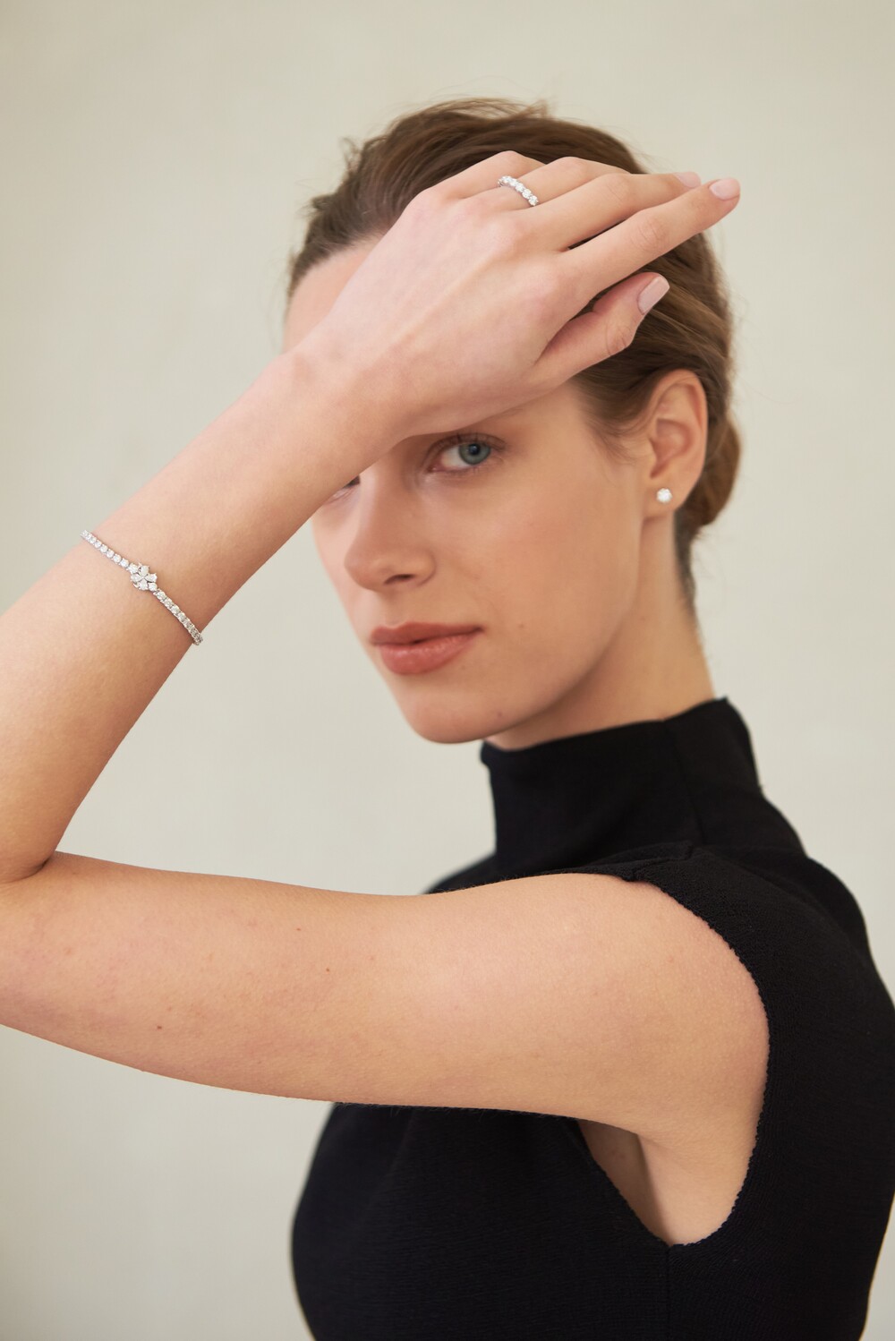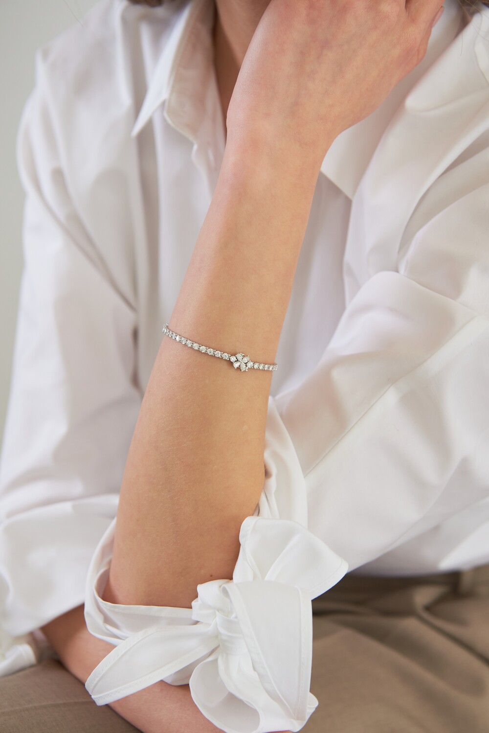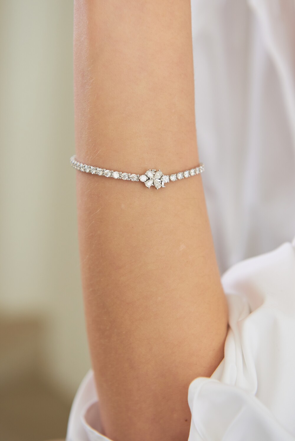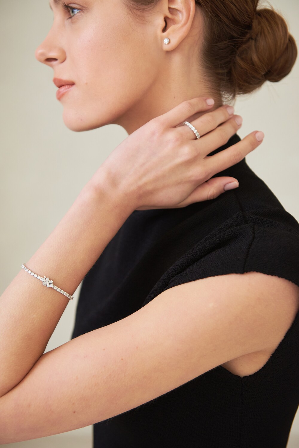 기존의 클래식한 테니스 팔찌를 보다 하이 주얼리스럽게 풀어낸 블러썸 테니스 브레이슬릿입니다. 꽃을 형상화한 네개의 페어컷 모이사나이트가 확실한 포인트가 되어주어 소장 가치있으며, 투웨이 연출이 가능합니다. 꽃을 강조한 포인트 팔찌로 착용하거나 꽃장식을 팔 안쪽으로 돌릴 경우 테니스 팔찌의 단정한 느낌 그대로 착용 가능합니다.