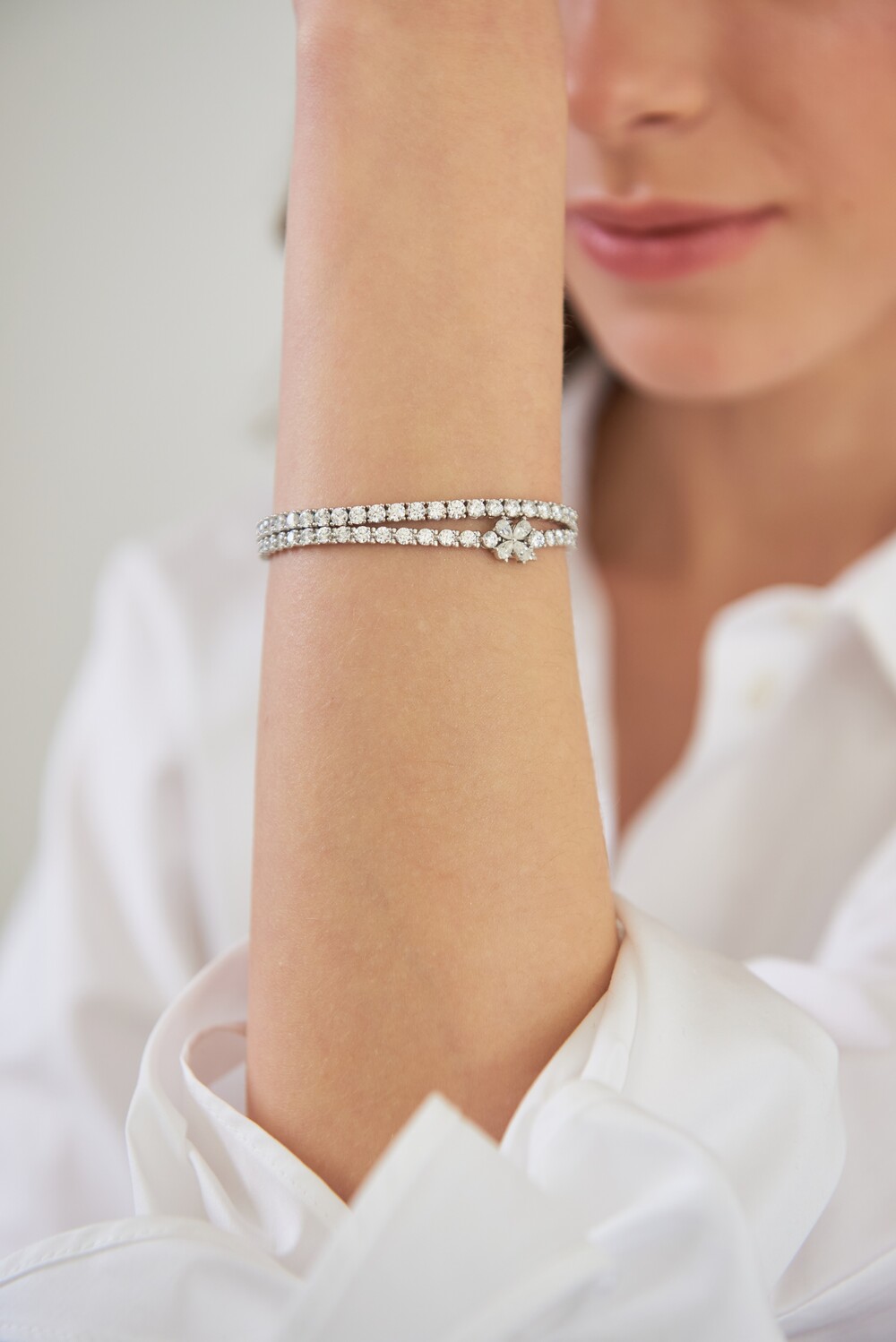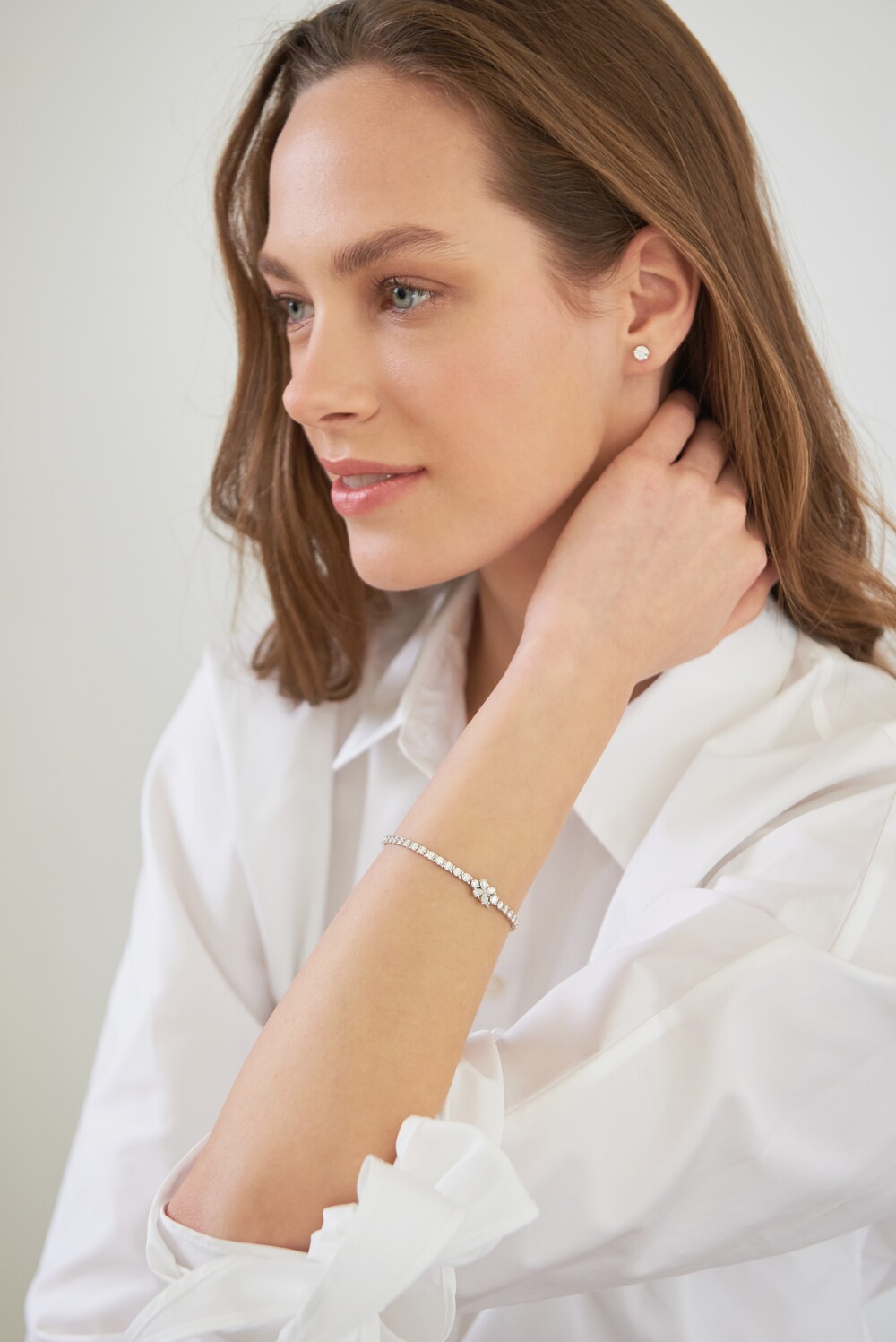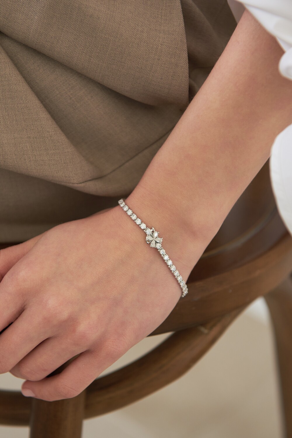 기존의 클래식한 테니스 팔찌를 보다 하이 주얼리스럽게 풀어낸 블러썸 테니스 브레이슬릿입니다. 꽃을 형상화한 네개의 페어컷 모이사나이트가 확실한 포인트가 되어주어 소장 가치있으며, 투웨이 연출이 가능합니다. 꽃을 강조한 포인트 팔찌로 착용하거나 꽃장식을 팔 안쪽으로 돌릴 경우 테니스 팔찌의 단정한 느낌 그대로 착용 가능합니다.