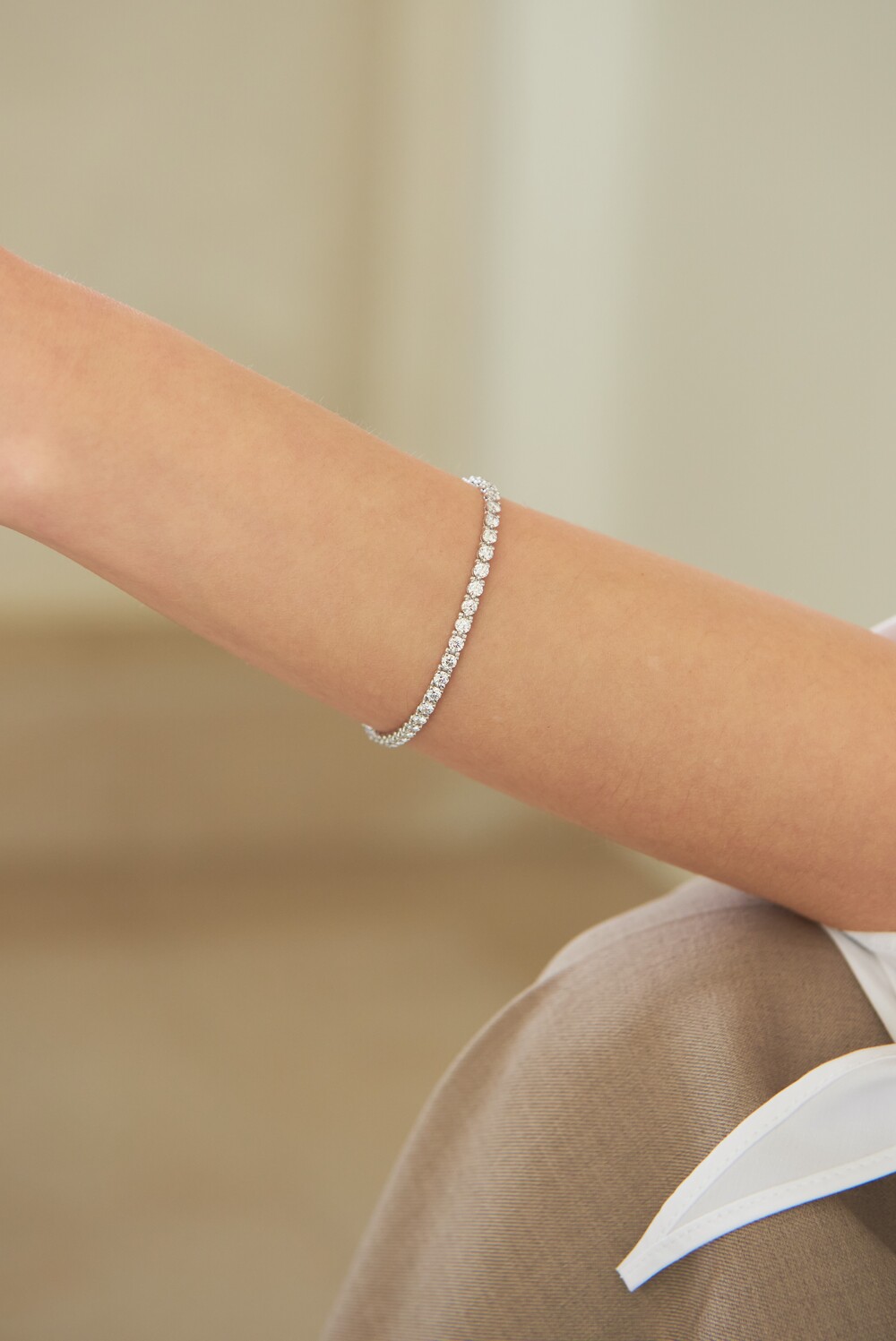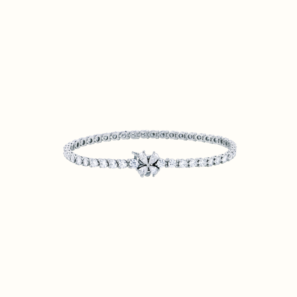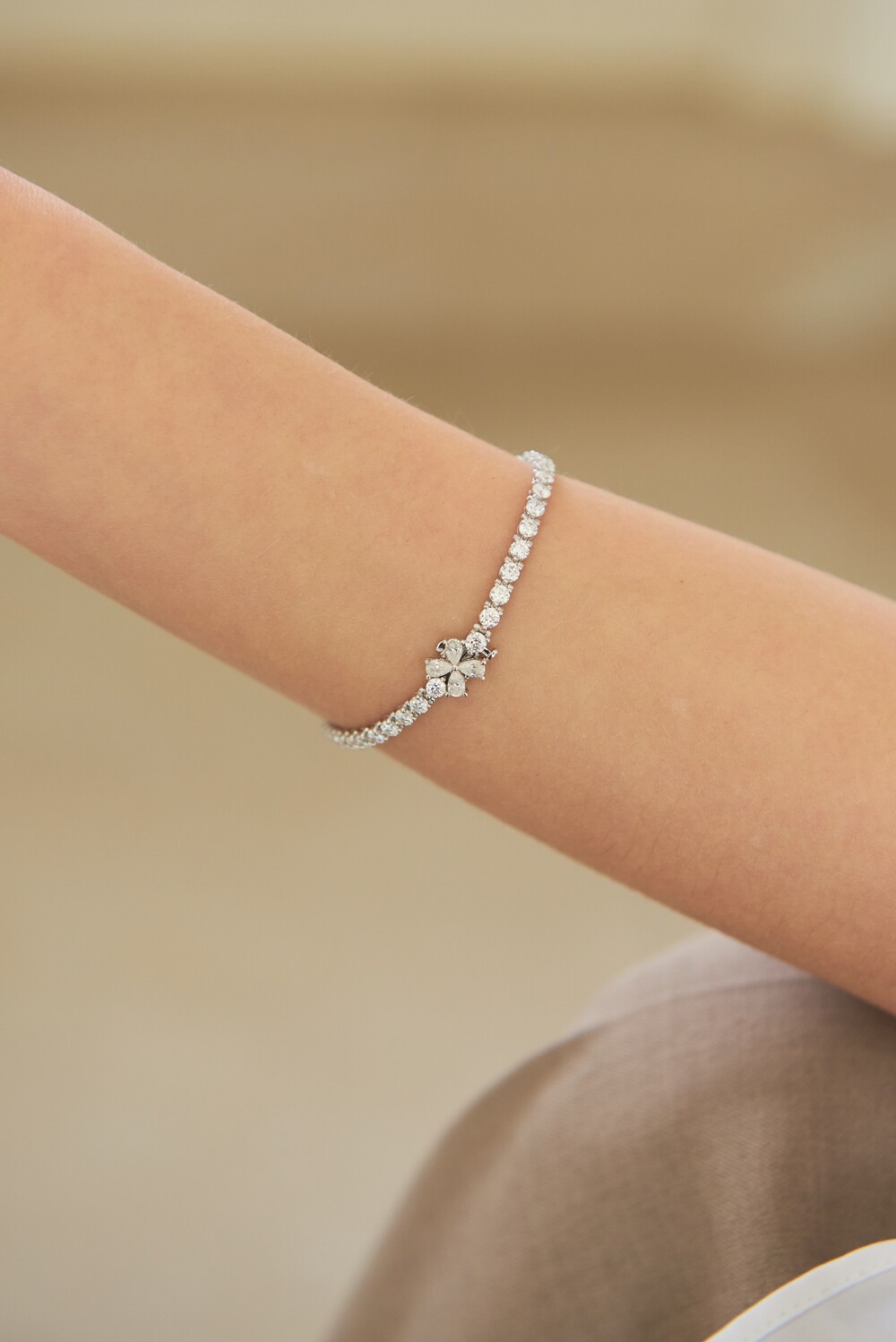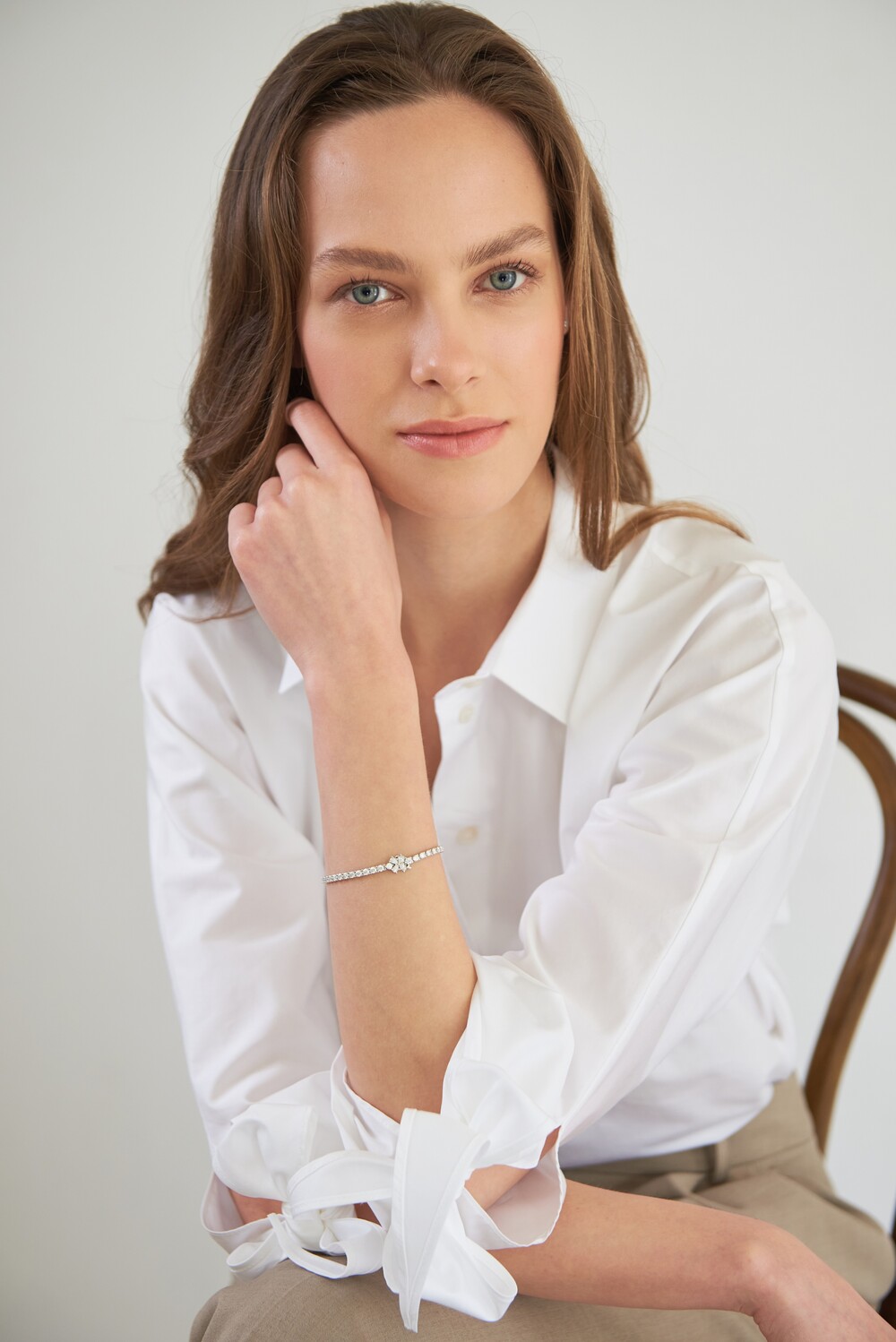 기존의 클래식한 테니스 팔찌를 보다 하이 주얼리스럽게 풀어낸 블러썸 테니스 브레이슬릿입니다. 꽃을 형상화한 네개의 페어컷 모이사나이트가 확실한 포인트가 되어주어 소장 가치있으며, 투웨이 연출이 가능합니다. 꽃을 강조한 포인트 팔찌로 착용하거나 꽃장식을 팔 안쪽으로 돌릴 경우 테니스 팔찌의 단정한 느낌 그대로 착용 가능합니다.