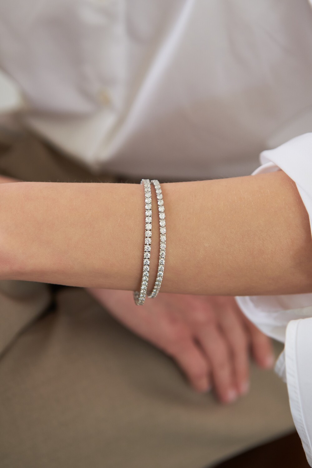 클래식 테니스 라인은 가장 기본적인 네발 물림으로 어느정도의 무게감과 중량감이 느껴지는 반면에, 블로썸 테니스는 세발 물림으로 좀 더 가볍고 유연하게 피부에 착 감기는 느낌입니다. 클래식 테니스 라인은 3mm(1부) 스톤이 셋팅되어 클래식한 느낌 그대로 재현했으며, 블로썸 테니스는 2.8mm 스톤이 셋팅되어 꽃봉아리 포인트를 더욱 살리면서도 좀 더 여리여리한 느낌으로 착용 가능합니다.