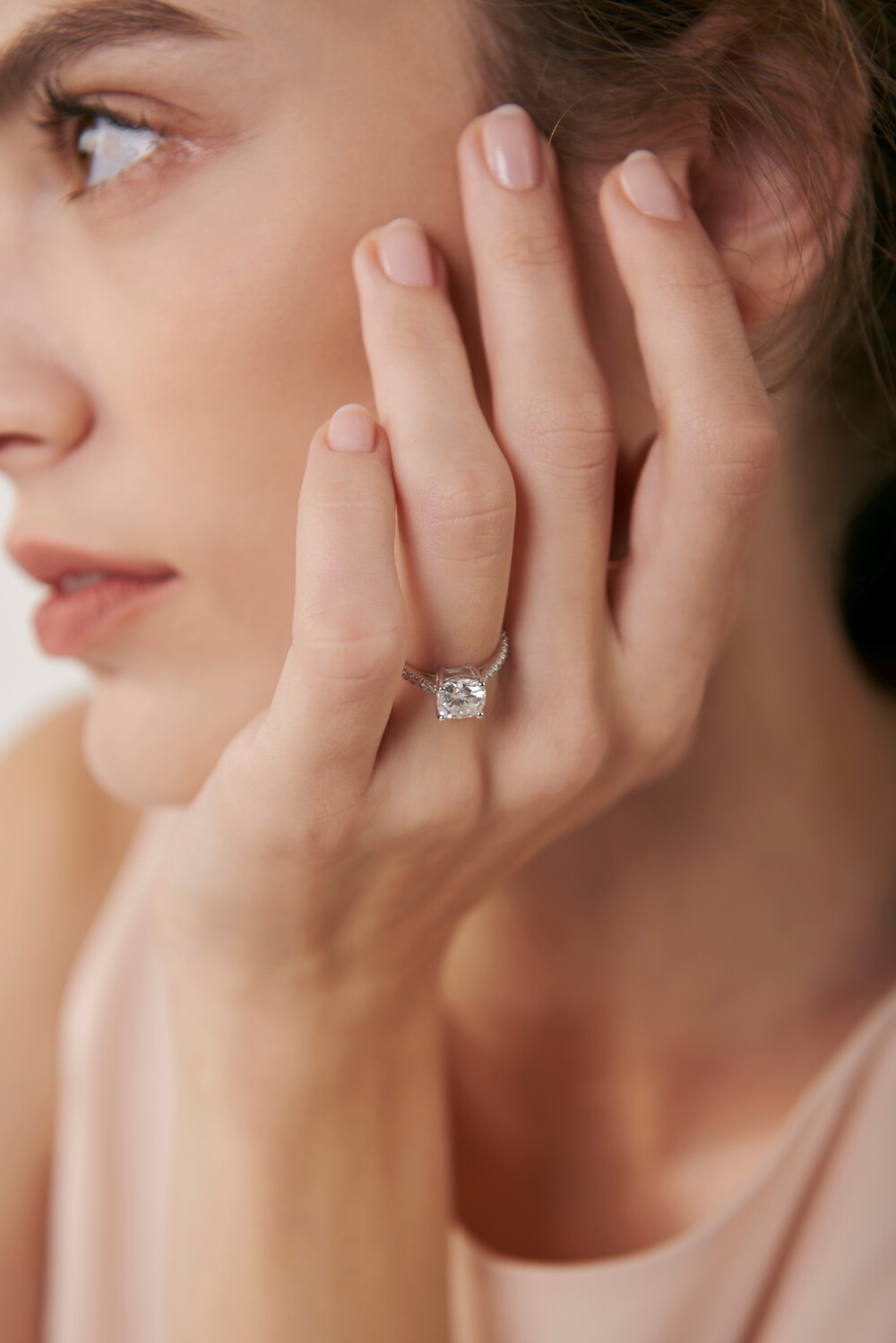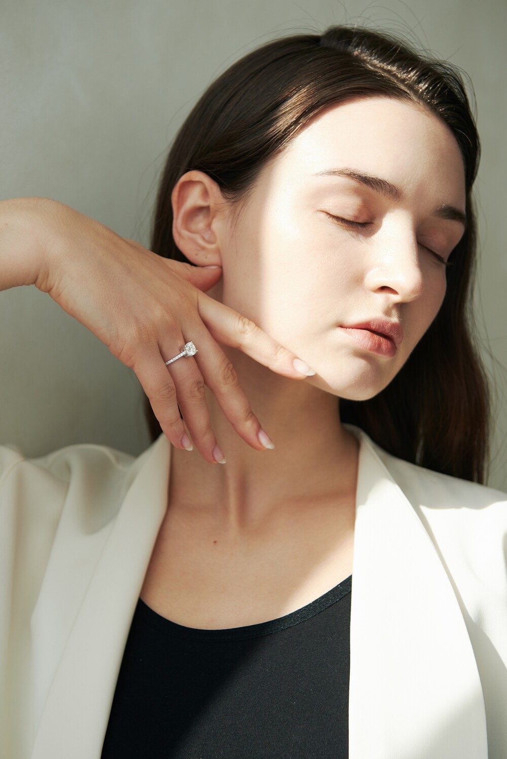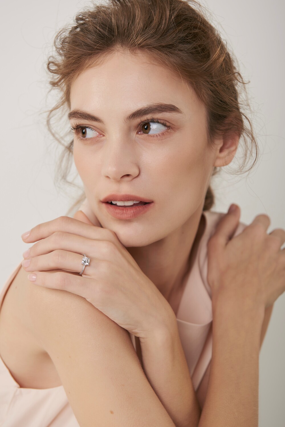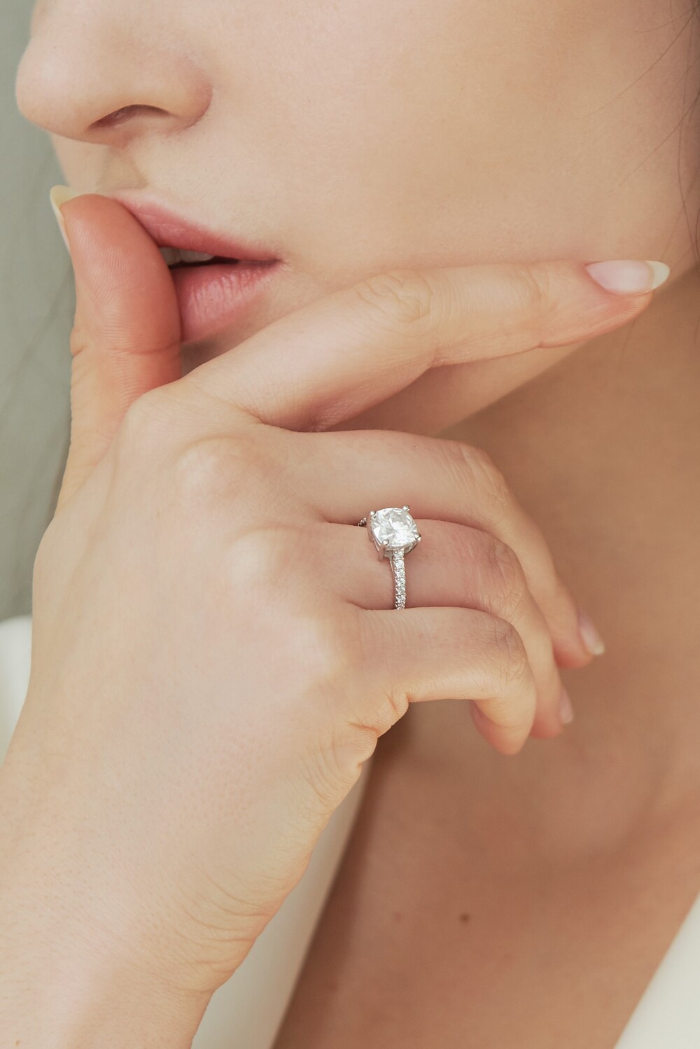 쿠션컷은 최근 헐리우드에서 각광받는 컷으로, 스퀘어와 라운드 중간의 볼륨감 있고 세련된 무드가 특징입니다. 사이드에도 멜리 모이사나이트를 사용해 피부가 더욱 밝고 환하게 연출되는 것은 물론, 편안한 착용감을 자랑하는 밴드 디자인으로 일상에서도 활용도가 높습니다. 뻔하지 않은 쉐입과 미니멀한 디자인으로 클래식한 무드는 그대로 가져가면서도 차별화되는 아름다움을 경험해 보세요.
