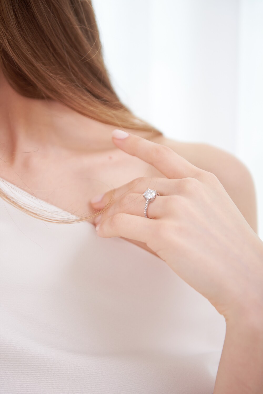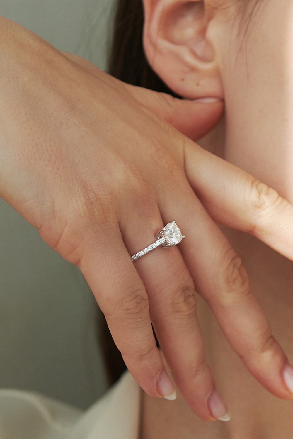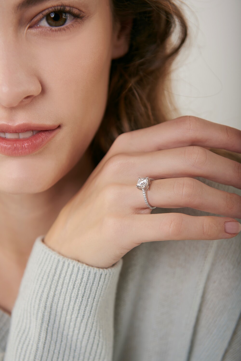 쿠션컷은 최근 헐리우드에서 각광받는 컷으로, 스퀘어와 라운드 중간의 볼륨감 있고 세련된 무드가 특징입니다. 사이드에도 멜리 모이사나이트를 사용해 피부가 더욱 밝고 환하게 연출되는 것은 물론, 편안한 착용감을 자랑하는 밴드 디자인으로 일상에서도 활용도가 높습니다. 뻔하지 않은 쉐입과 미니멀한 디자인으로 클래식한 무드는 그대로 가져가면서도 차별화되는 아름다움을 경험해 보세요.