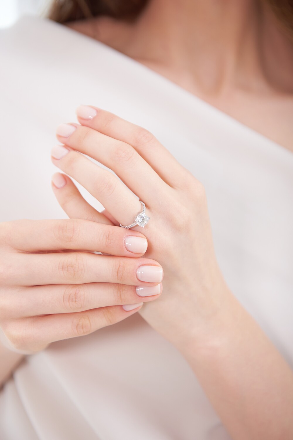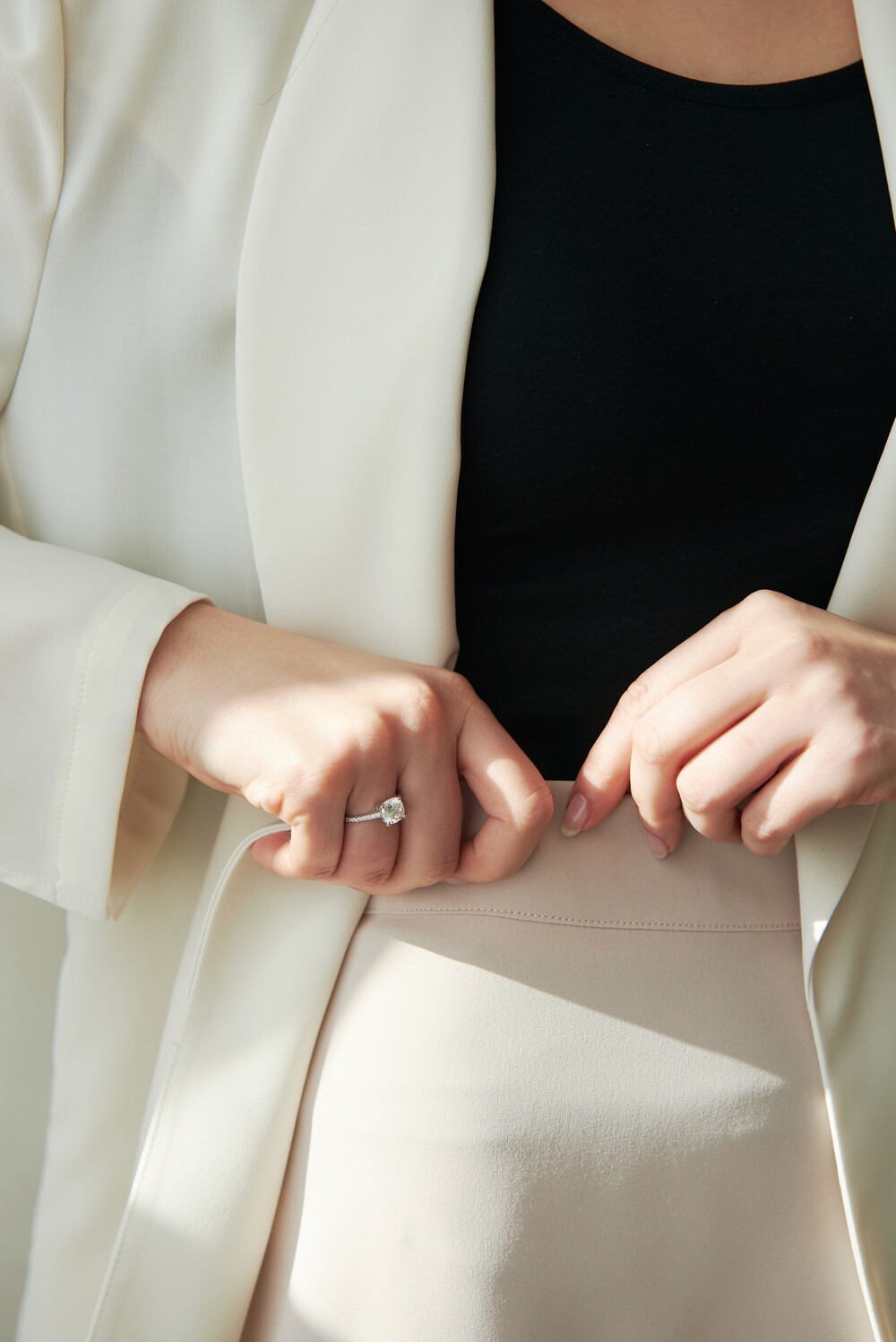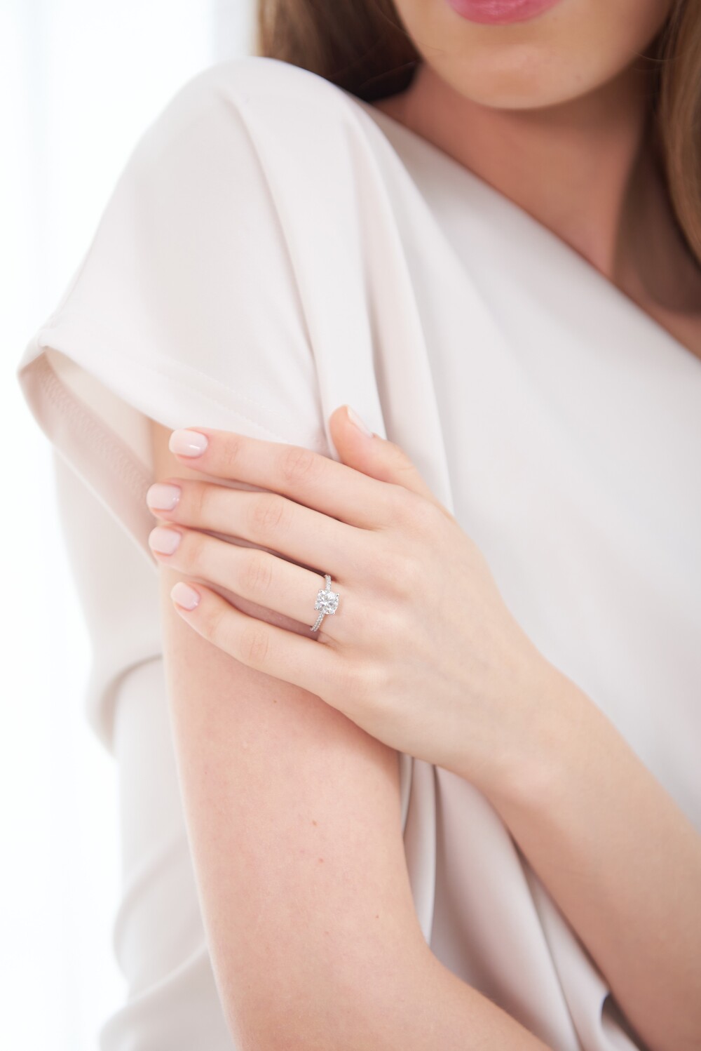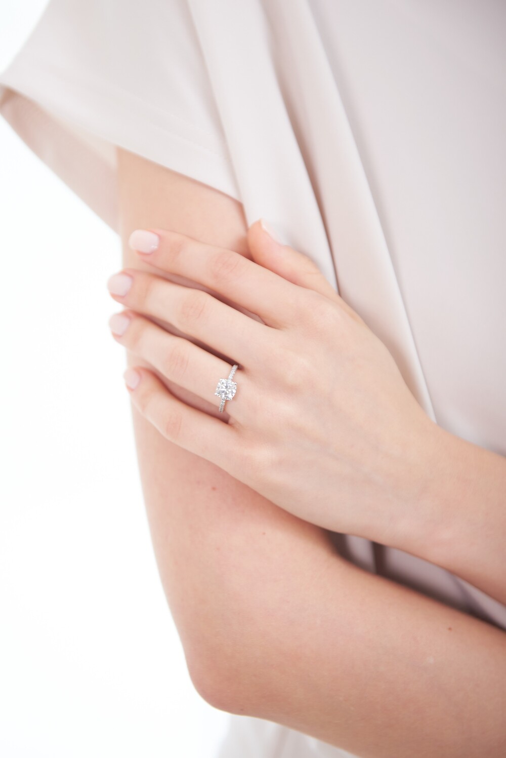 쿠션컷은 최근 헐리우드에서 각광받는 컷으로, 스퀘어와 라운드 중간의 볼륨감 있고 세련된 무드가 특징입니다. 사이드에도 멜리 모이사나이트를 사용해 피부가 더욱 밝고 환하게 연출되는 것은 물론, 편안한 착용감을 자랑하는 밴드 디자인으로 일상에서도 활용도가 높습니다. 뻔하지 않은 쉐입과 미니멀한 디자인으로 클래식한 무드는 그대로 가져가면서도 차별화되는 아름다움을 경험해 보세요.