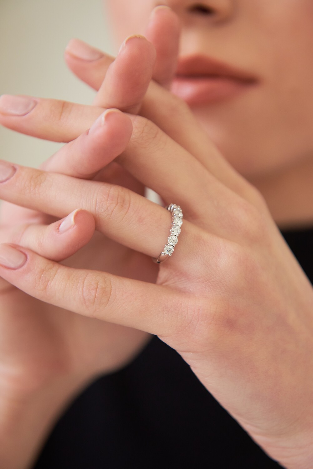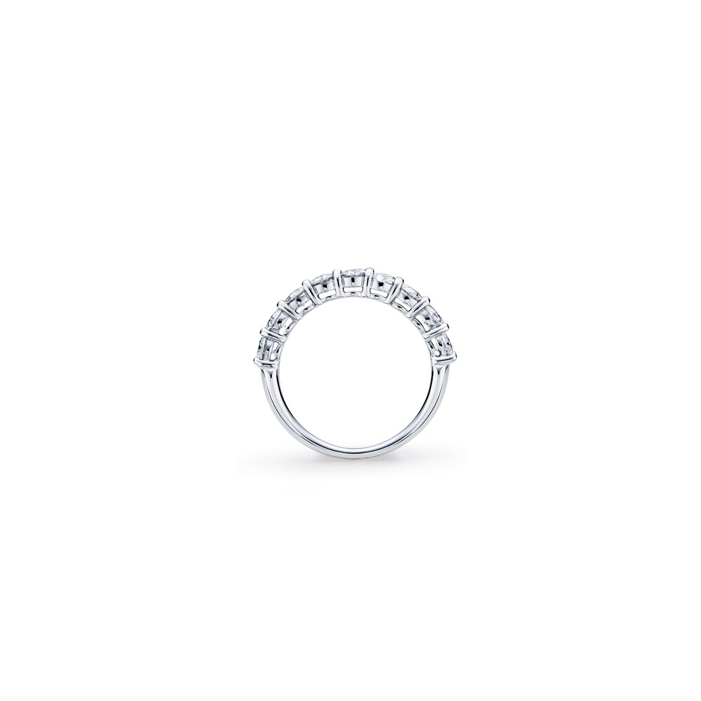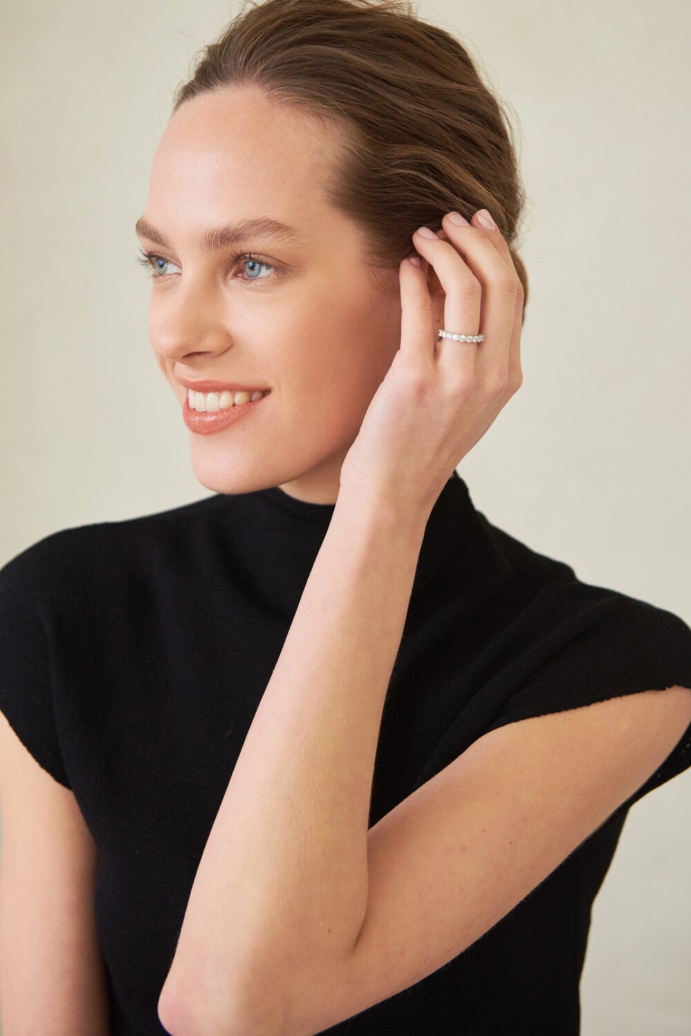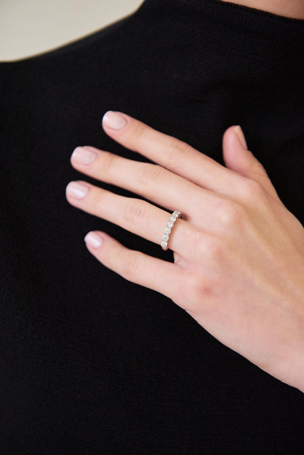 존재감 있는 사이즈의 이터니티 밴드로, 단독으로 착용해도 확실한 포인트가 되어줍니다. 하프 밴드로 편안한 착용감을 자랑하면서도 측면에서 봤을 때에도 비어 보이지 않도록 빼곡히 스톤을 세팅해주었습니다. 베이직한 디자인이지만 측면에서 미세하게 가늘어지는 밴드 디자인으로 전체적으로 균형감있게 표현했습니다.