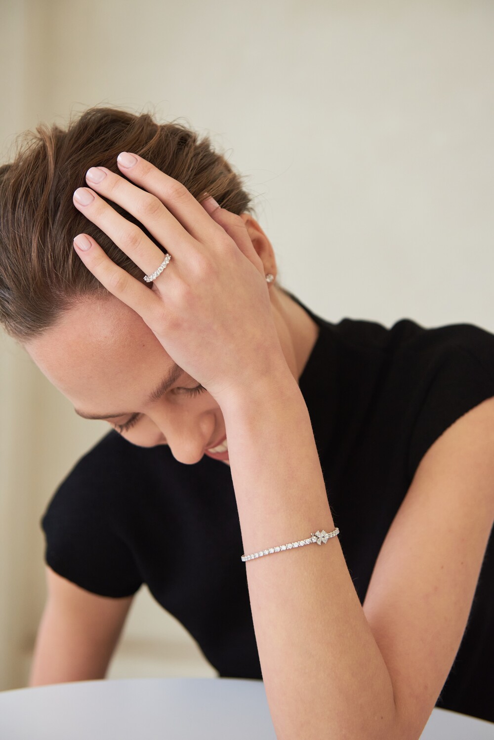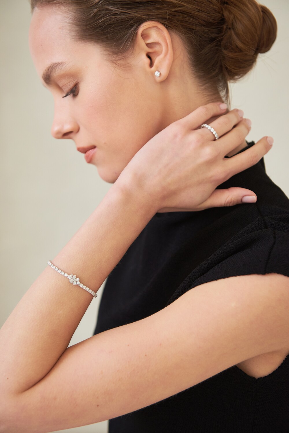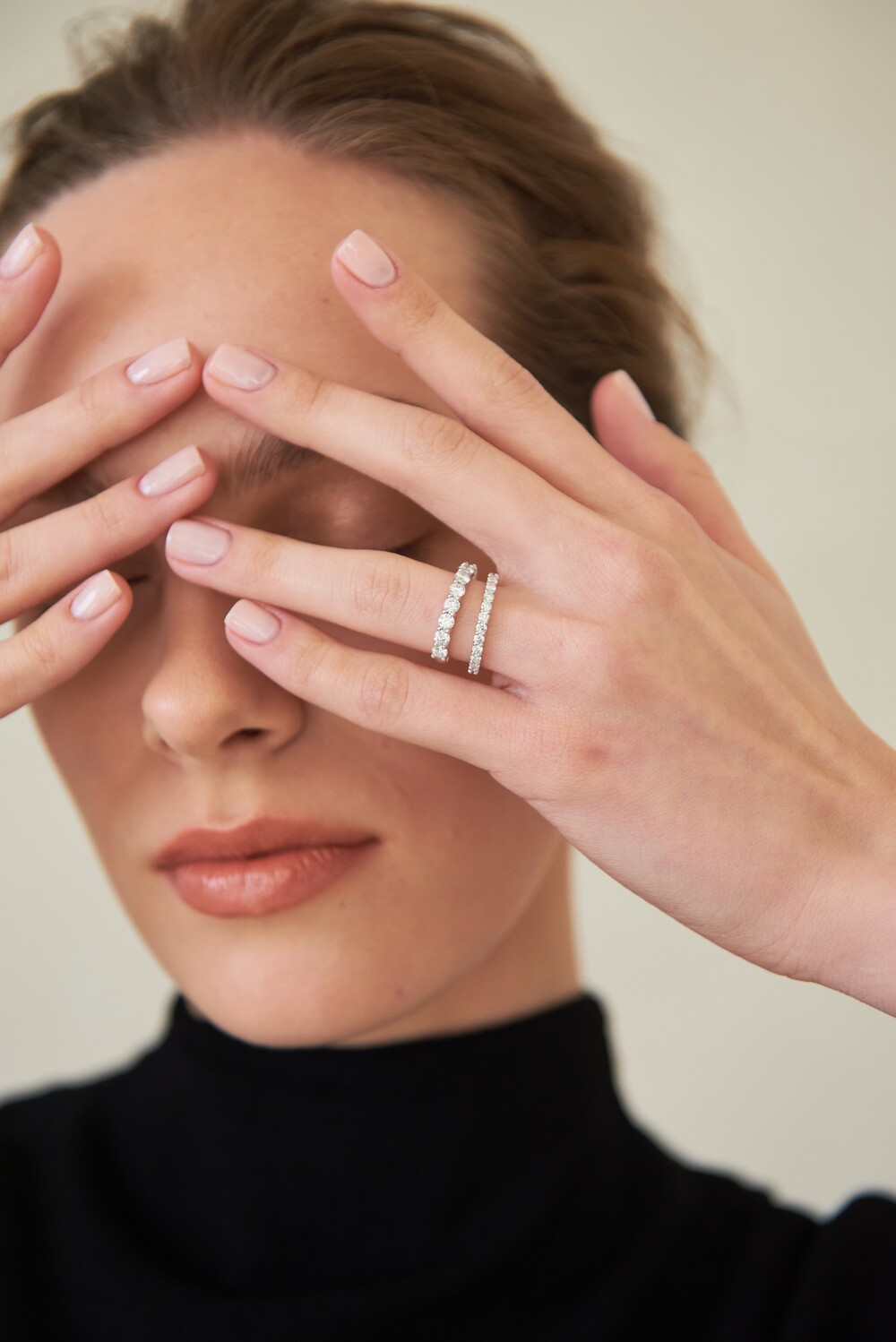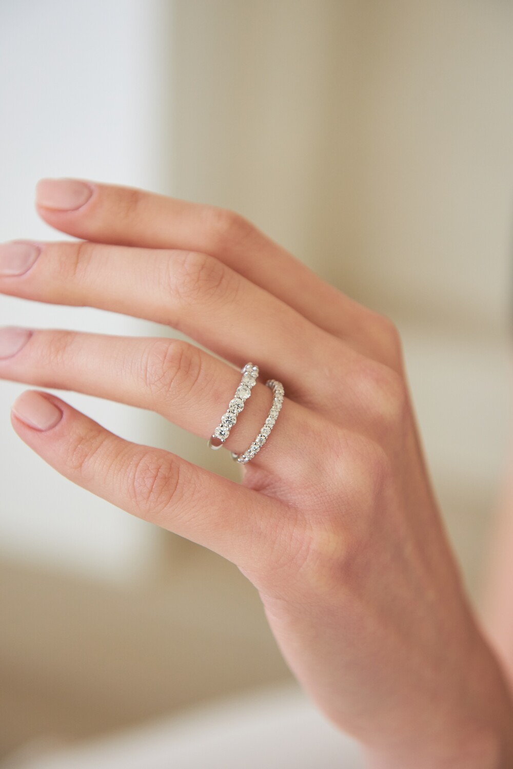 존재감 있는 사이즈의 이터니티 밴드로, 단독으로 착용해도 확실한 포인트가 되어줍니다. 하프 밴드로 편안한 착용감을 자랑하면서도 측면에서 봤을 때에도 비어 보이지 않도록 빼곡히 스톤을 세팅해주었습니다. 베이직한 디자인이지만 측면에서 미세하게 가늘어지는 밴드 디자인으로 전체적으로 균형감있게 표현했습니다.