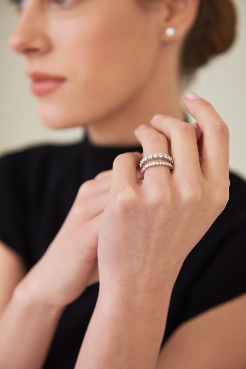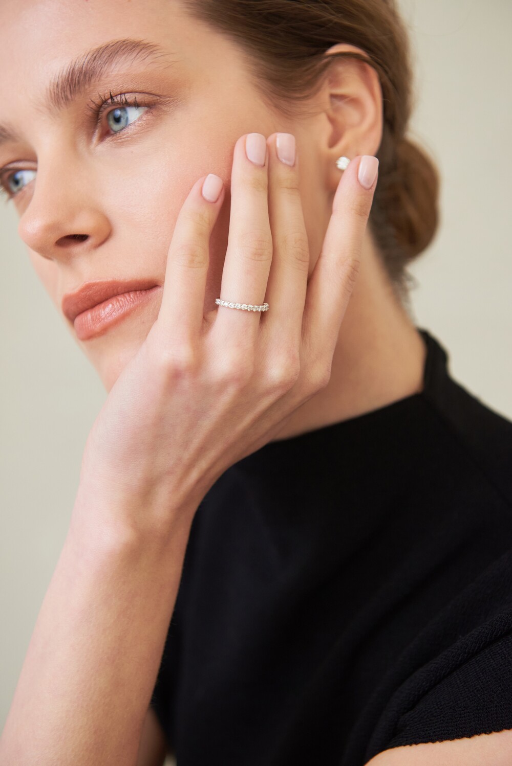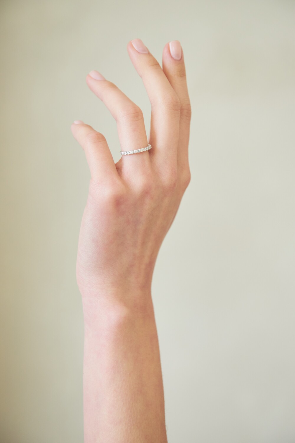 단독 및 레이어드 착용 시 은은한 존재감을 발휘하는 작은 사이즈의 이터니티 밴드입니다. 하프 디자인으로 우수한 착용감을 자랑하면서도 측면에서 봤을 때에도 비어 보이지 않게 빼곡히 스톤을 물려주었습니다. 낀듯 안낀듯한 내추럴한 분위기를 선호하는 분들께 추천드립니다.
