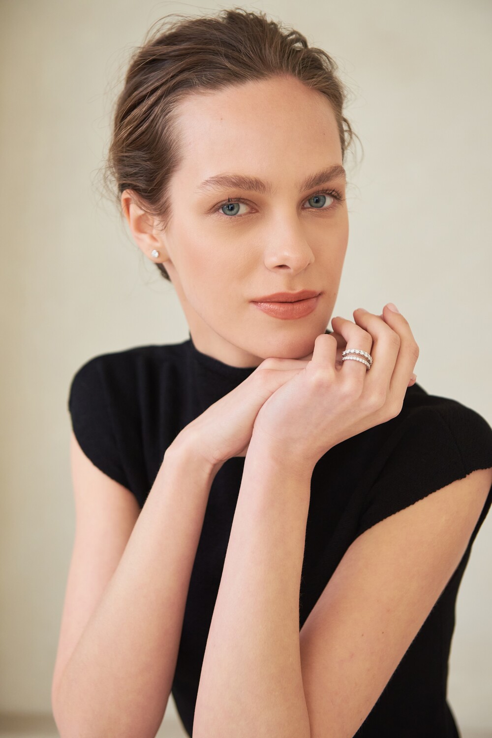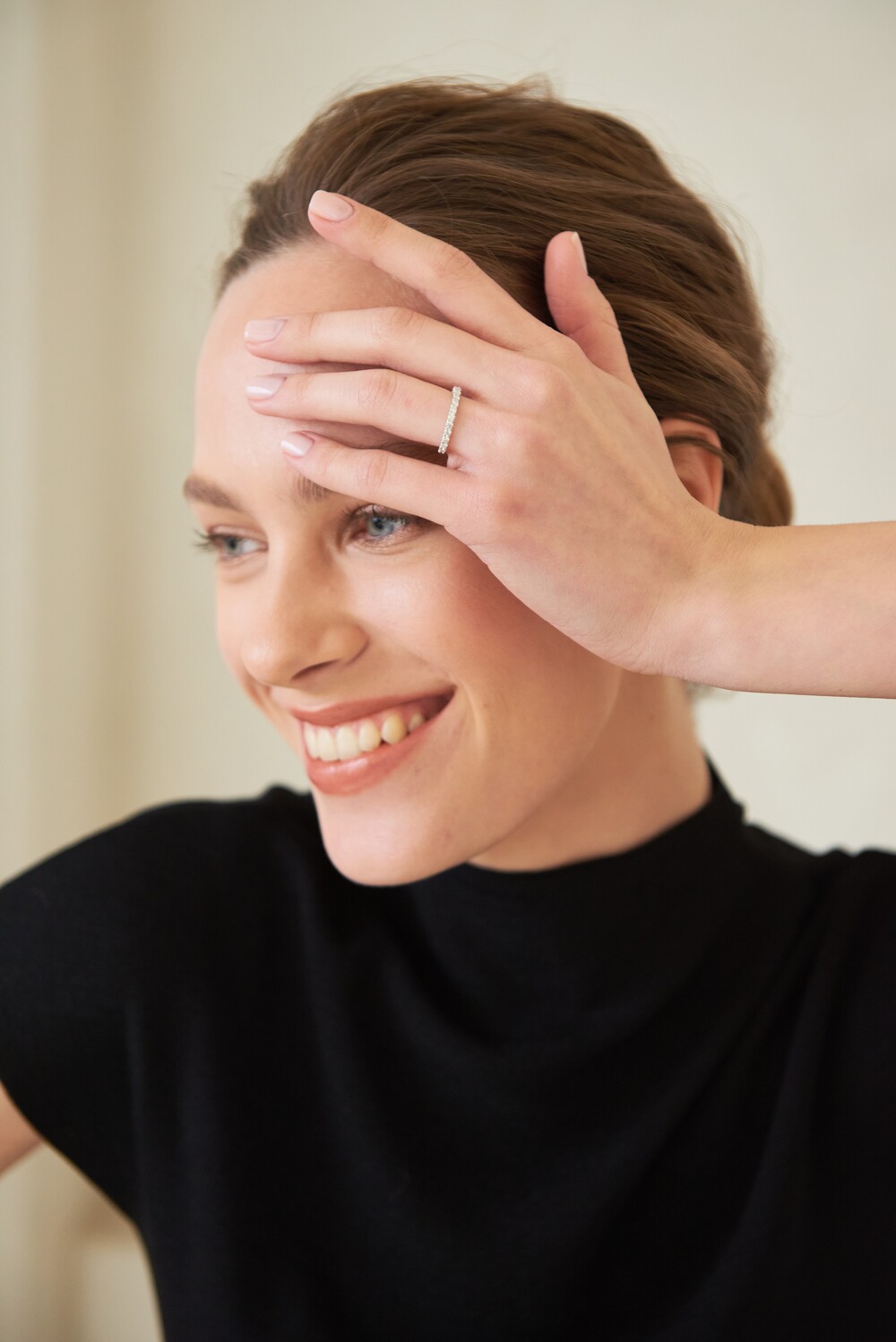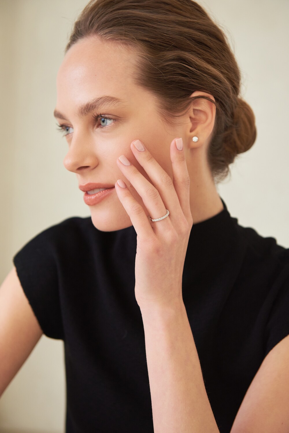 단독 및 레이어드 착용 시 은은한 존재감을 발휘하는 작은 사이즈의 이터니티 밴드입니다. 하프 디자인으로 우수한 착용감을 자랑하면서도 측면에서 봤을 때에도 비어 보이지 않게 빼곡히 스톤을 물려주었습니다. 낀듯 안낀듯한 내추럴한 분위기를 선호하는 분들께 추천드립니다.